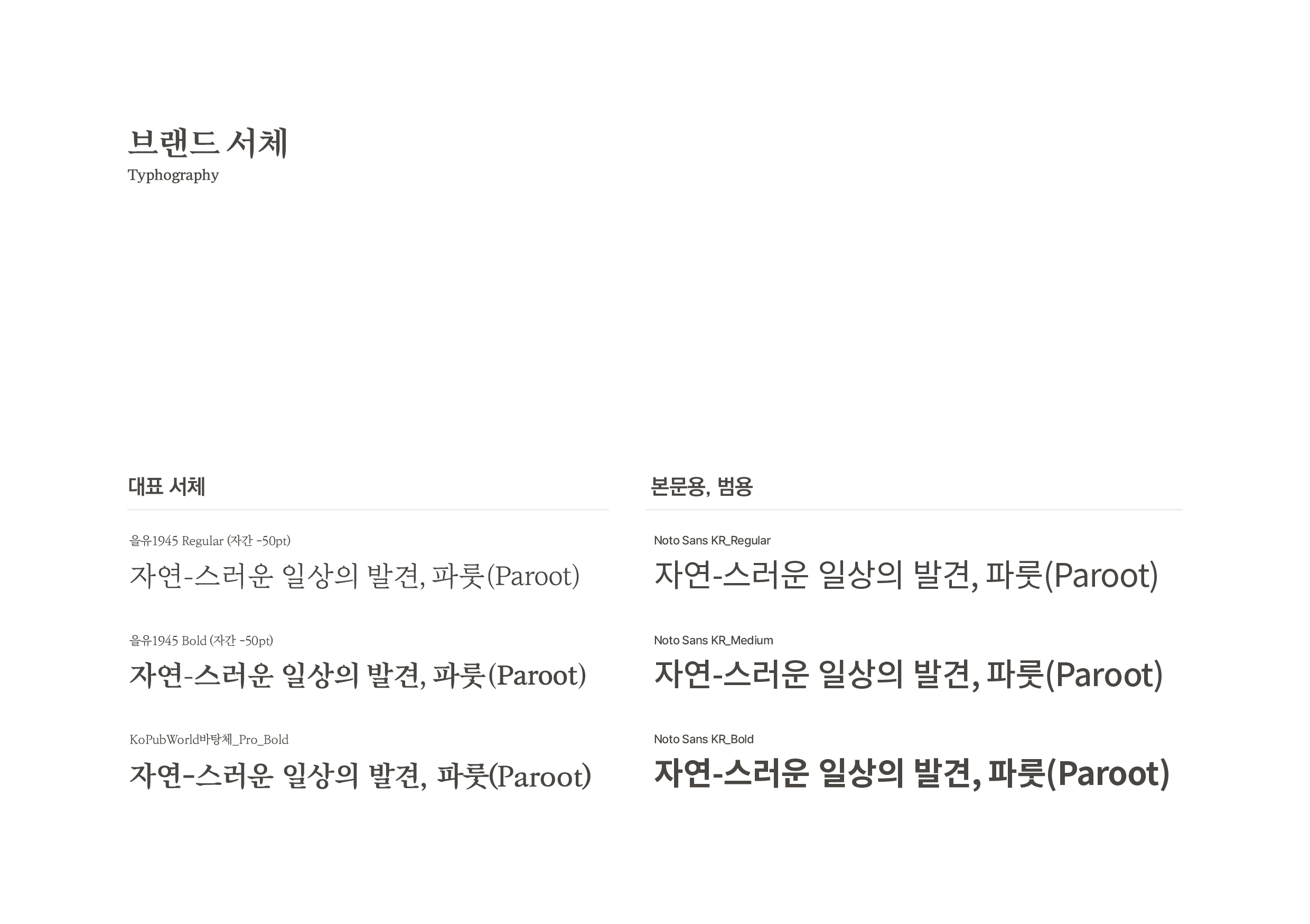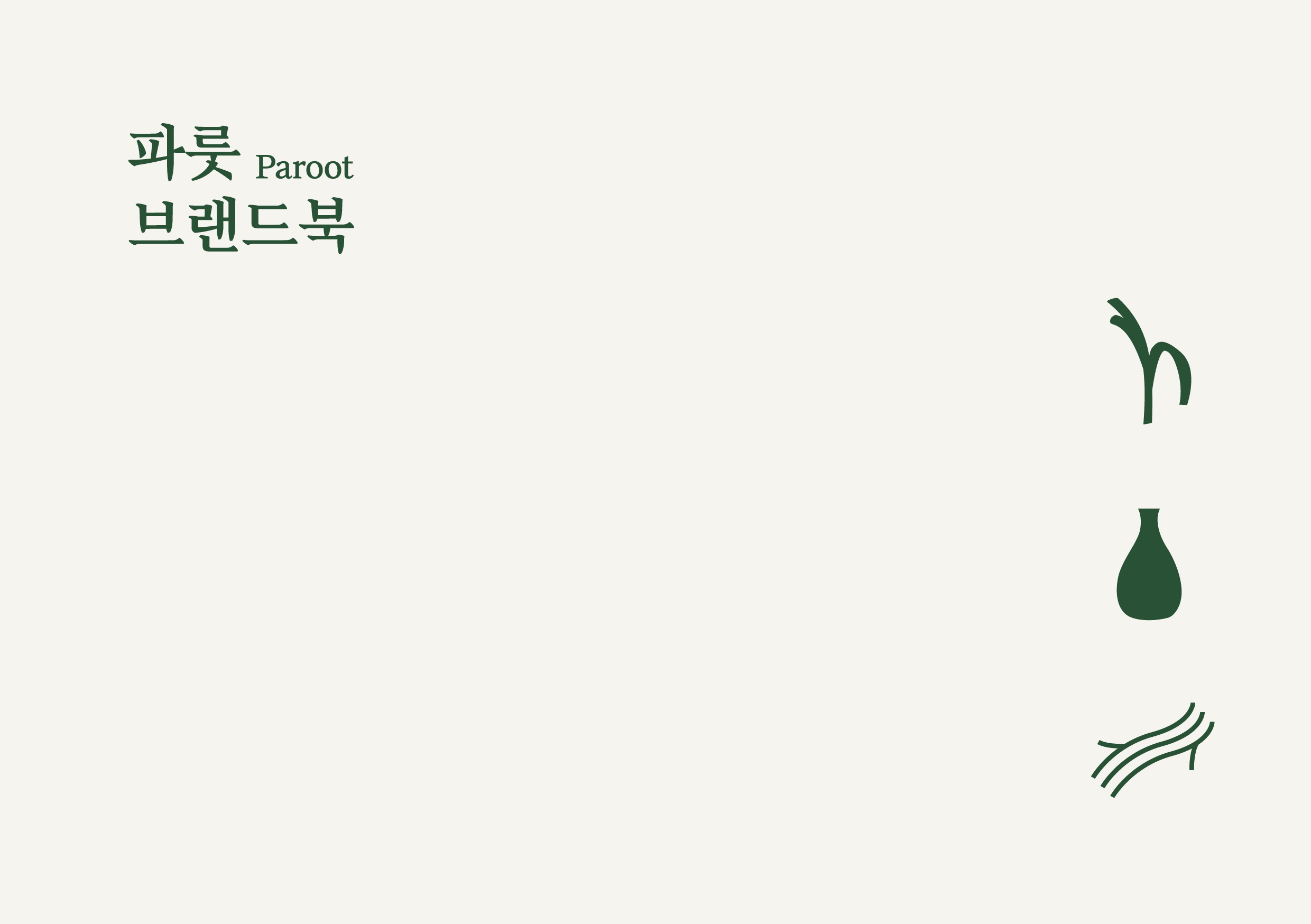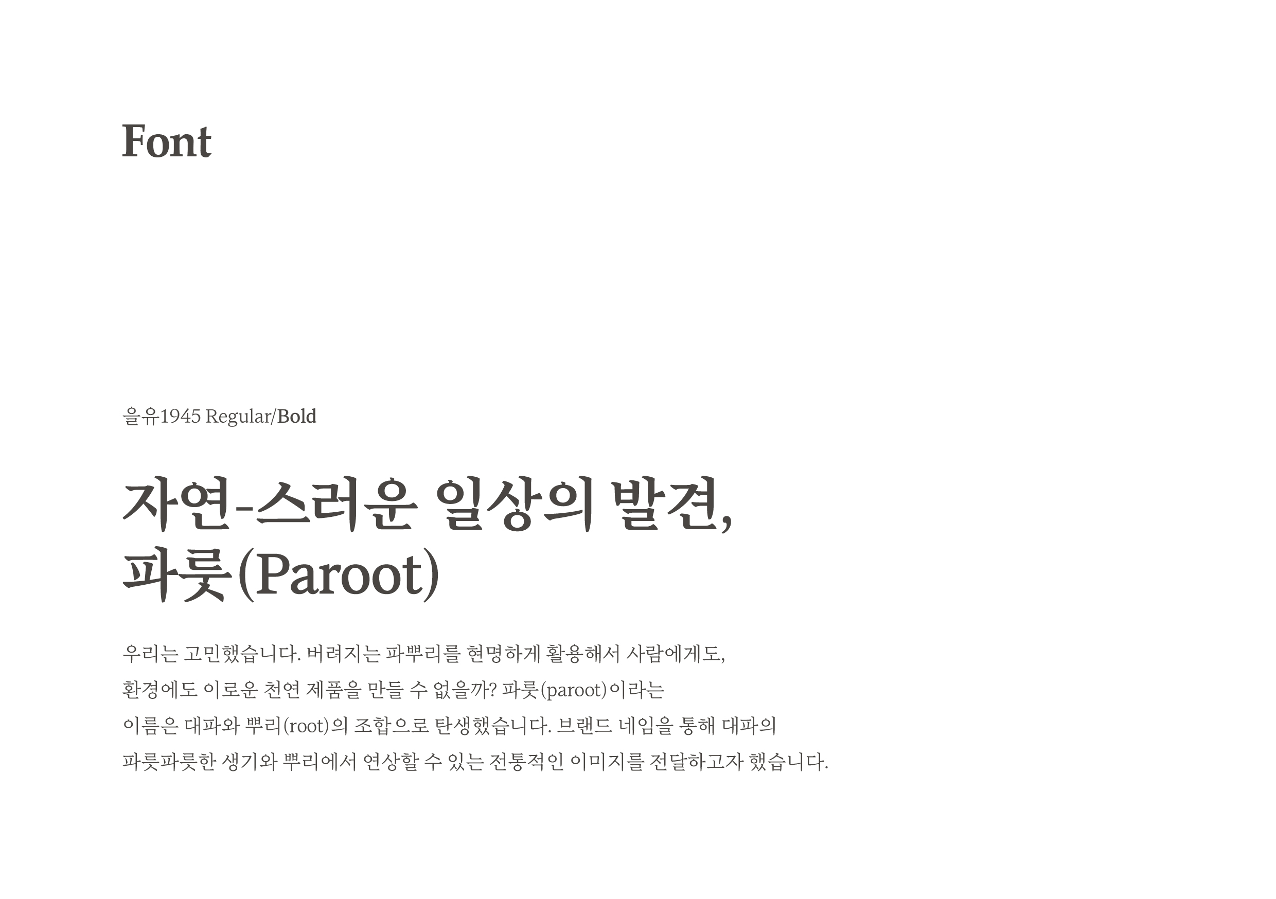 자연의 숨겨진 가능성을 발견하는 친환경 브랜드, 파룻(Paroot) 입니다. 파뿌리를 활용한 천연 제품으로 사람과 환경 모두 안심하고 쓸 수 있는 메세지가 담긴 브랜드 언어 개발과 로고, 컬러, 폰트, 패키지에 필요한 브랜딩 작품을 만들었습니다.