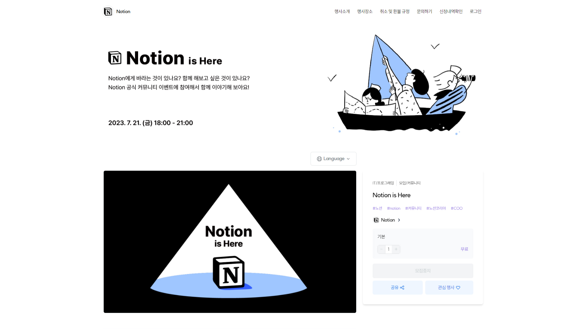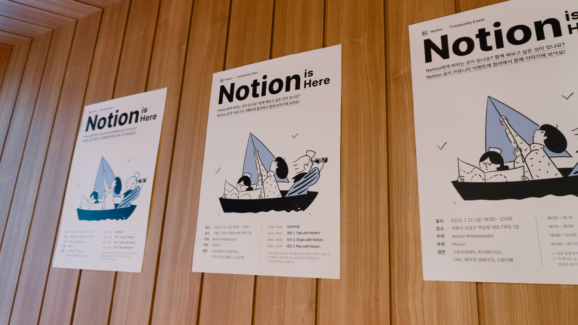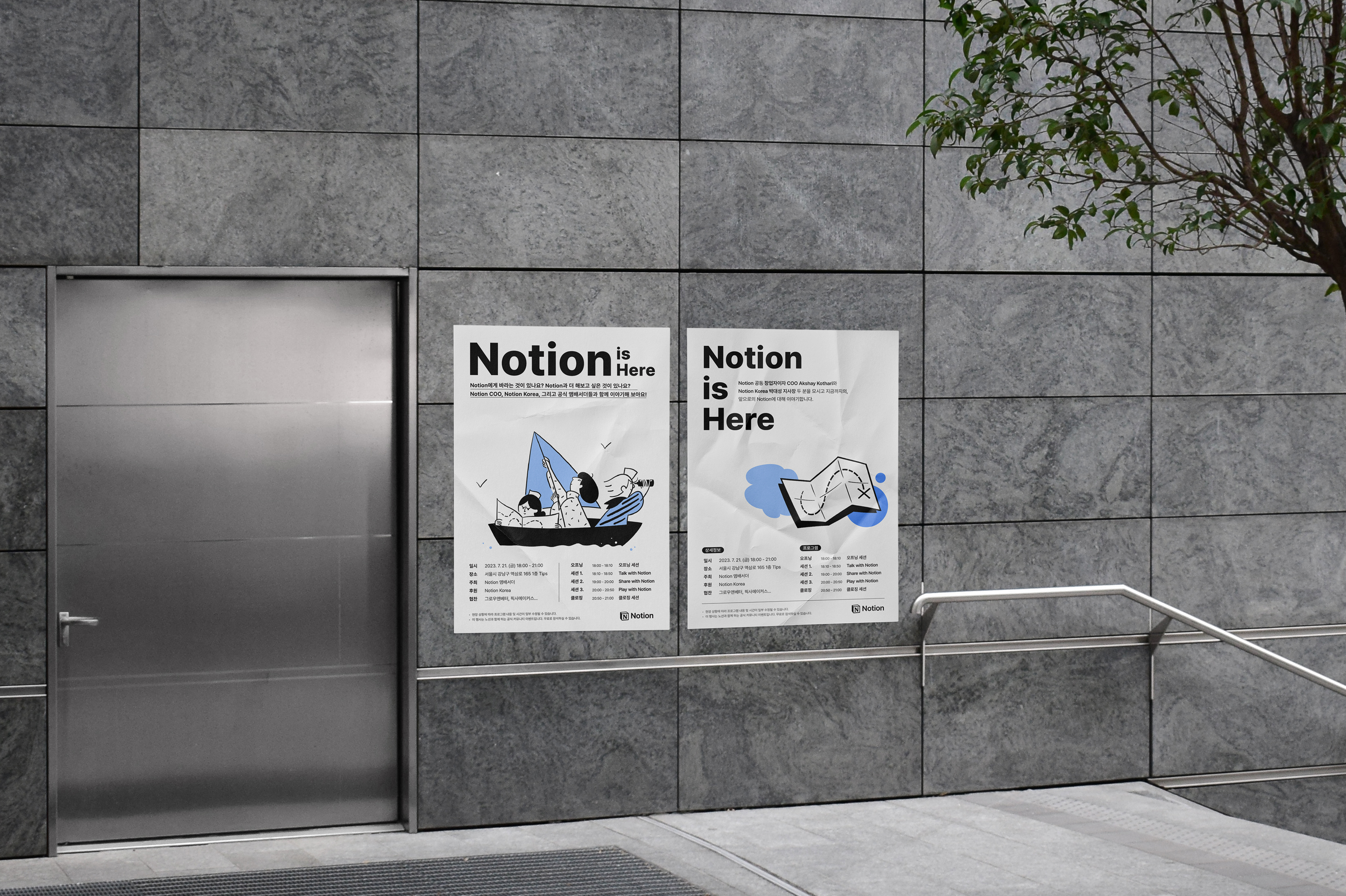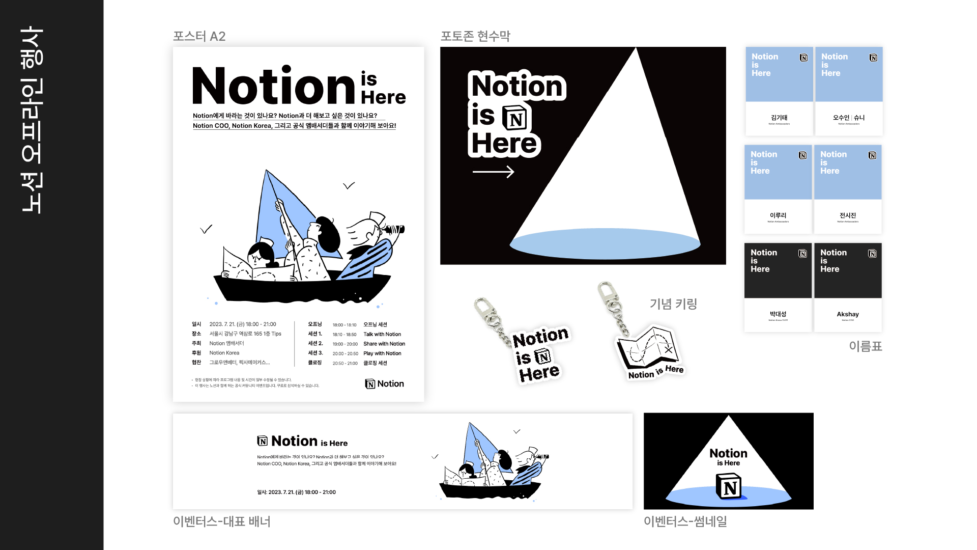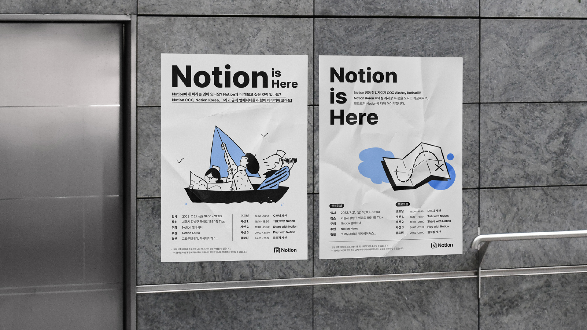 노션 코리아에서 주최한 <2023 : Notion is Here> 행사 브랜딩 디자인을 진행했습니다. 노션의 Co-founder이자 COO인 Akshay Kothari, 한국 지사장 박대성님을 모시고 앞으로의 노션의 방향성에 대해 고민하는 행사이므로 이러한 방향성을 배와 지도라는 키비주얼을 통해 풀어냈습니다.
