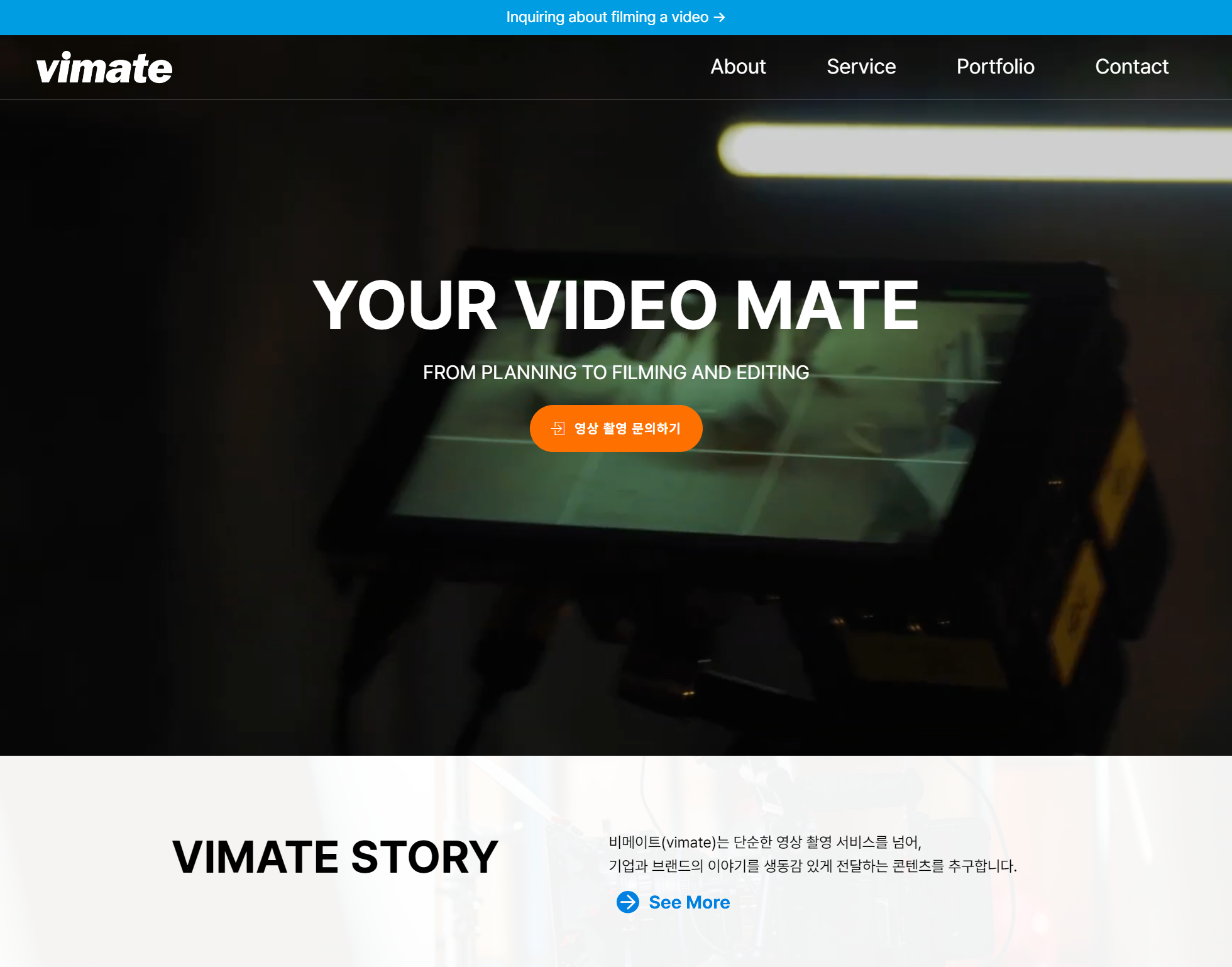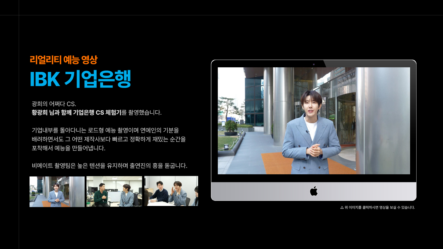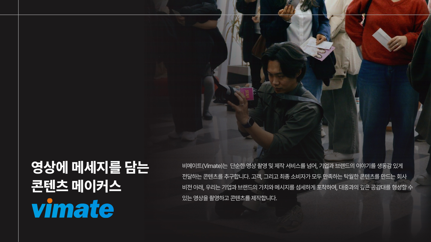 단순한 영상 촬영 서비스를 넘어, 기업과 브랜드의 이야기를 생동감 있게 전달하는 콘텐츠를 추구하는 비메이트 브랜딩을 진행하였습니다. 웹사이트 구축,회사소개서,명함 등 브랜드 이미지를 일관되게 정돈하는 작업을 진행하였습니다.
