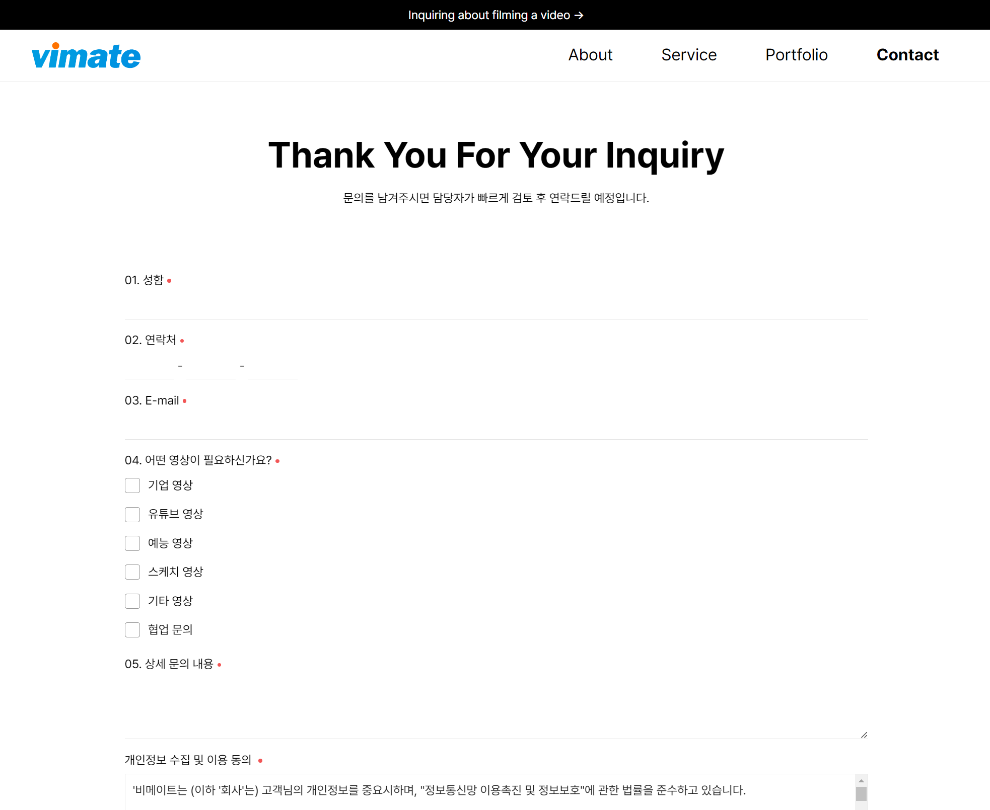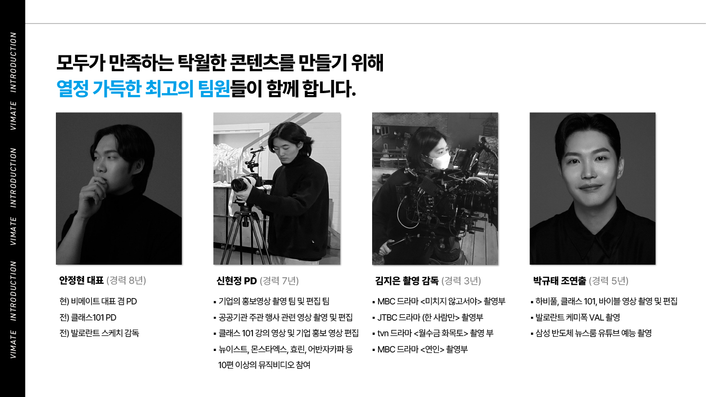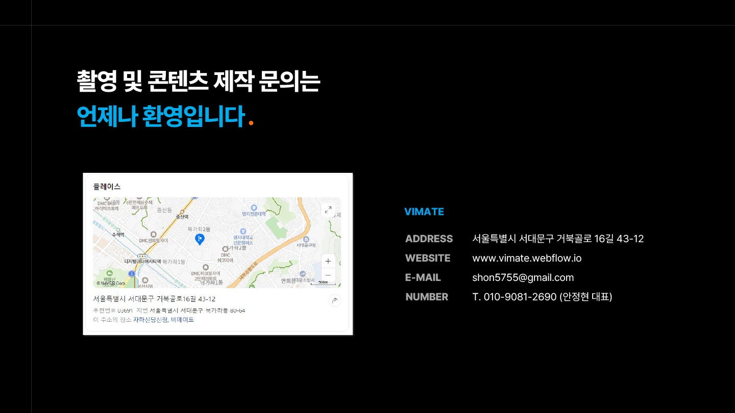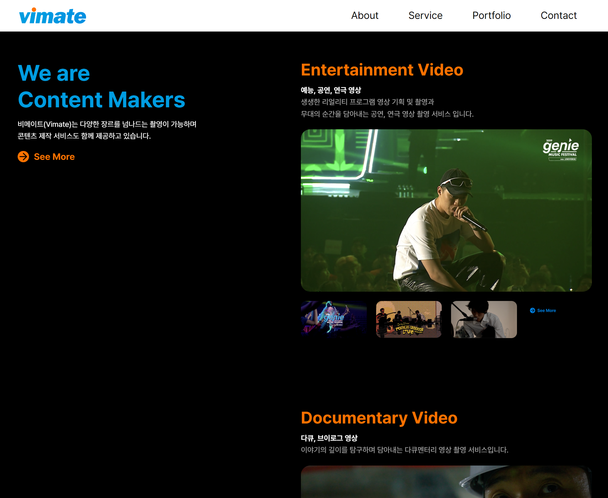 단순한 영상 촬영 서비스를 넘어, 기업과 브랜드의 이야기를 생동감 있게 전달하는 콘텐츠를 추구하는 비메이트 브랜딩을 진행하였습니다. 웹사이트 구축,회사소개서,명함 등 브랜드 이미지를 일관되게 정돈하는 작업을 진행하였습니다.